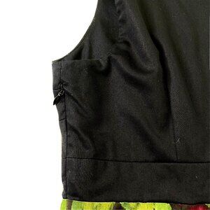 Bodice is solid black, skirt is black, red and green floral