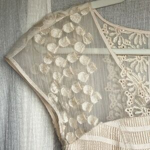 This is an elegant whimsical dress in true Anthropologie style to be worn on special occasions. Gorgeous paired with pearls or even fun with ankle boots and a denim jacket. The skirt has four layers with an inside lining, a tulle netting layer, another lining, and the outside embroidery layer. The dress has beautiful detail from the shoulders and bodice, all the way down to the hem. You'll feel like you've gone back in time. The color is Ivory and the size is 4.