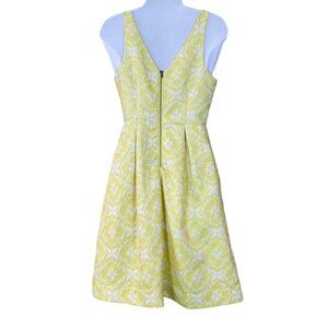 This sleeveless dress features a sophisticated yellow brocade pattern, offering a refined style. Ideal for warm weather events, its tailored fit provides an elegant silhouette. The V-neckline and pleated skirt add classic charm, making it a versatile piece for various occasions.
