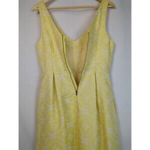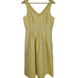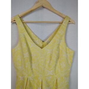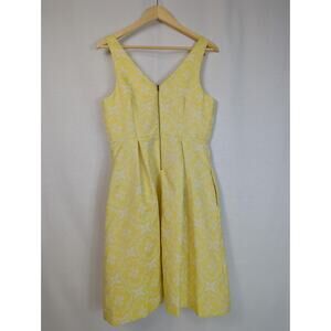 Gently used, doesn't have original belt and has some underarm pilling as seen in picture. Sleeveless, v-neck and v back design with back zipper. Darted bust, pleated skirt with lace and tulle slip. Vintage look, yellow with floral white jacquard pattern. Strap holders, pockets. Fit and flare, A-Line fit. Size 8, Bust 17.5", Waist 14.5", Length 39"