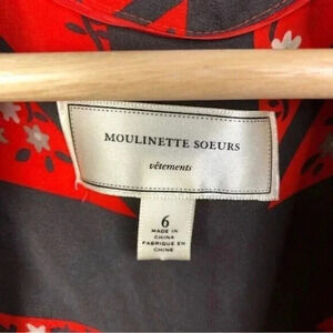 Anthropologie Moulinette Soeurs Maeshowe Red Silk Button Down Mini Dress Good used condition, minimal signs of wear. - Red & black printed - Short sleeves - Shirt dress fit - Full button up front - V-Neck neckline - 100% silk Measurements - Bust 18 - Length 36 All items ship from a smoke & pet free environment. All orders ship same or next business day.
