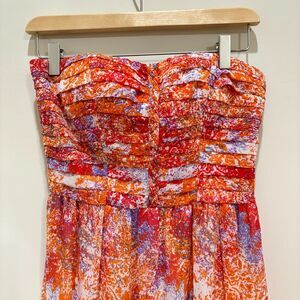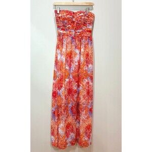 Features: Gorgeous chiffon Vernalis maxi dress by Moulinette Soeurs from Anthropologie. Convertible - wear it strapless or wear it with the attached straps. Pleating at the bodice. Orange, pink abstract floral pattern. Perfect for any special occasion like prom, homecoming, or cocktail parties!