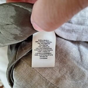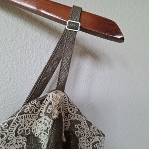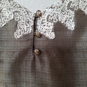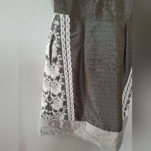 Mini Dress. Sweetheart neckline with buttons. Adjustable straps. Lined. Crocheted cream color detailing. Body is an olive green with shimmer. Hem is linen like with shimmer. Pockets. Side zip closure. Womens size 4 Pit to pit flat lay 17" length from neckline to hem 27" measurements are approximate