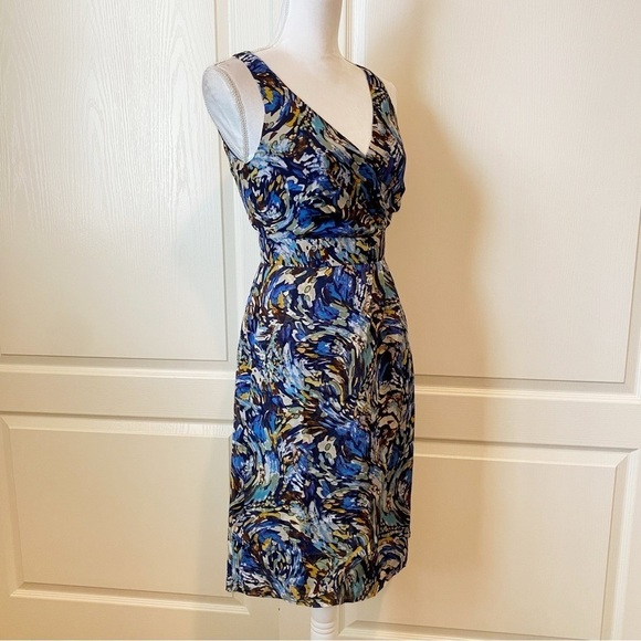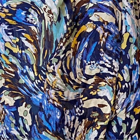 •Blue floral pattern - Beautiful blue, green, and brown tones color this silk surplice frock, like glimpses of a sun-washed sky through the trees.