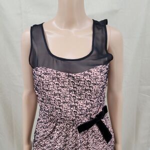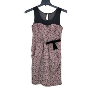 Dusty pink body with Sheer black yoke/ straps. Black velvet textured design. Cinched waist. Detachable black velvet bow at waist. No flaws or wear.