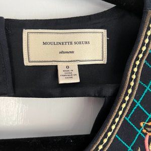 Never worn, gorgeous embroidery! Moulinette Soeurs black sleeveless structured PERENNIAL A-line dress with floral embroidery from Anthropologie. Size 0. Modal cotton blend.
