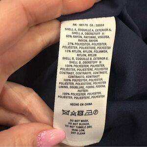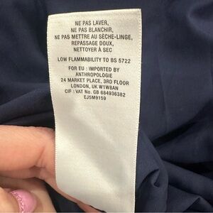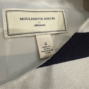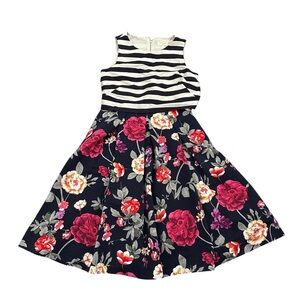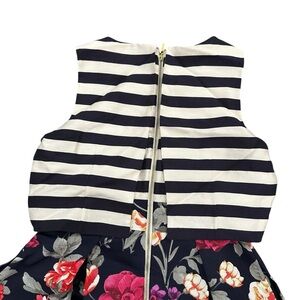 Beautiful Moulinette Soeurs Split Print Dress! Navy blue and ivory off white striped sleeveless top portion Skirt portion is Navy blue with pink, red, gray, and purple floral print Split back with gold exposed zipper Box pleated a-line skirt Midi knee length Lined Rayon/poly/nylon blend