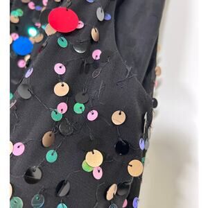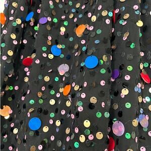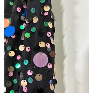 Vibrant sequin halter top from Moulinette Soeurs by Anthropologie. Black base with multicolor sequins throughout. Lightweight, fully lined, and slip-on with gathered neckline. Perfect for festivals, parties, or bold everyday looks. Size Small. Good condition with minor loose threads. Missing button.