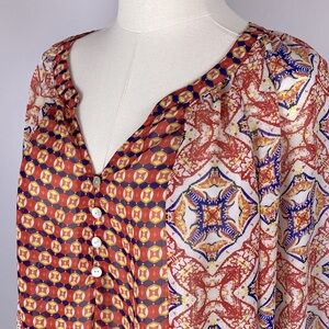 Flowy boho blouse with intricate patterns. Features a mix of red, blue, and cream hues. Perfect for casual wear.