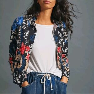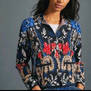 Chic knit jacket with a multicolor pattern. Features blue, red, and black tones. Ideal for a stylish look.