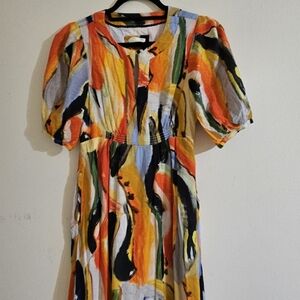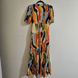 Vibrant maxi dress with abstract patterns. Features short sleeves and a flowing silhouette. Perfect for a bold statement. One of the sleeves is slightly tighter than the other (manufacturing flaw maybe?) but it’s not noticeable to anyone except you while you’re wearing it. Super cute and comfy!