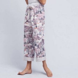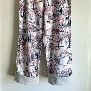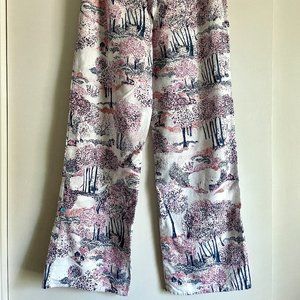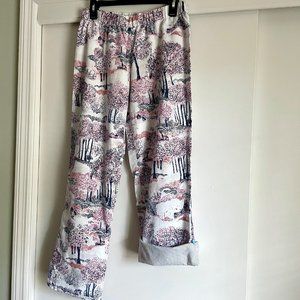 Comfortable pajama pants with a scenic print. Features elastic waistband. Perfect for lounging.