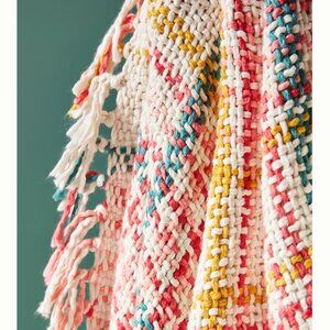Cozy plaid throw with fringe. Features red, yellow, and blue stripes. Perfect for adding warmth and style.