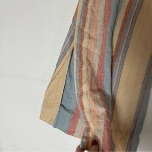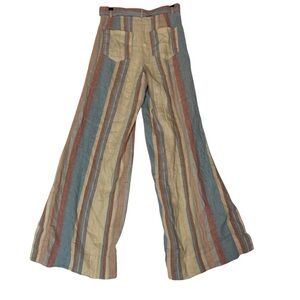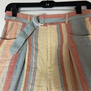 Wide-leg trousers with a striped pattern. Features a belt and high waist. Perfect for casual outings.