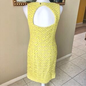 Muse Yellow Embroidered Crochet Dress sold at Anthropologie• Open back with snap button and loop closure• Side zipper• Fully lined with nude material• GUC
