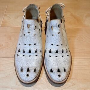 Anthropologie Musse & Cloud Coolise Western Bohemian Cutout Ankle Booties. Features cutout geometric detailing on leather upper. Small heel. Upper back/heel has lace up style.