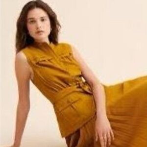 Chic mustard maxi dress with a sleeveless design. Features a belted waist and pleated skirt. Ideal for stylish outings. Measurements laid flat: 16" pitvto pit, 14" waist, 48" long.