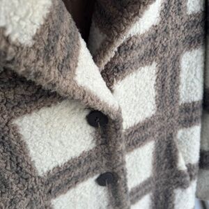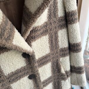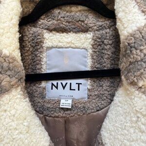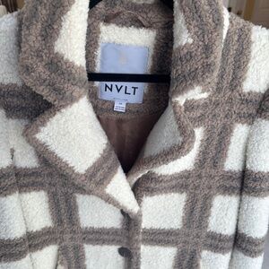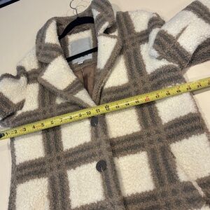 Anthropologie NVLT cream and tan plaid teddy coat. Excellent condition, worn maybe twice. Three button front with two front slit pockets. Roughly 42.5” in length from center shoulder to bottom hem and 20” from pit to pit. Please refer to photos for measurements and content.