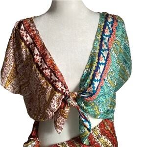 Versatile set can be worn together or separately, to lunch, dinner, pool or beach. Tie front crop top with split flutter sleeves. Skirt is side tie open split. All over contrasting boho prints.