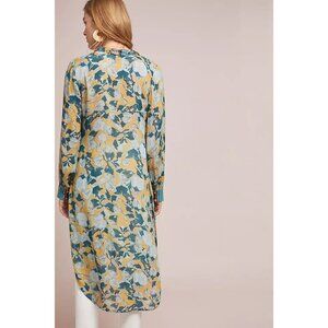 Anthropologie Blank London (sometimes stylized as Bl-nk or Bl^nk) Lucia Tunic Top in Blue Motif size Large. This spring, let a long, flowy layer play the role of your favorite dress. Semi-sheer. Long sleeves. High-low hemline. Side splits. Button front. V neckline with ruffled detailing. Mixed prints- striped yoke and cuffs with florals everywhere else. New with tags attached.