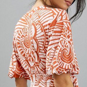 Faux wrap-like cropped top in an exotic motif. Deep v-neck is sure to turn heads.