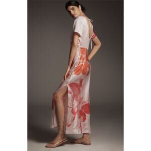 Anthropologie NWT Short Sleeve Floral Satin Maxi Slip Dress Pink Combo Size M