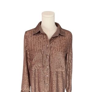 Add a touch of sparkle to your wardrobe with this stunning brown blouse featuring delicate sequin detailing. Perfect for dressing up your favorite jeans or pairing with a sleek skirt for a night out.