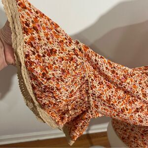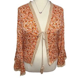 Complement all your cottagecore boho looks with this open front tassel tie lightweight cardigan. Pretty rust and pink floral print that is shot through with gold metallic thread. Sleeves end in a ruffle for a bell sleeve look.