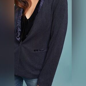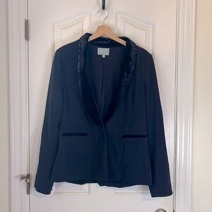 Elegant navy blazer with luxurious velvet trim. Perfect for a sophisticated look worn three times, exceptional condition and beautifully made by Skies are Blue. Fits a 10-12.