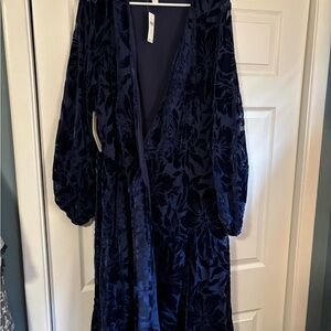 Elegant navy blue maxi dress. Features floral patterns. Long sleeves with a wrap style.