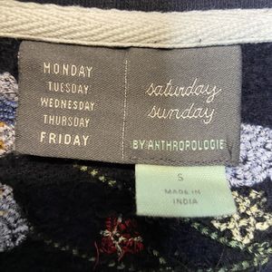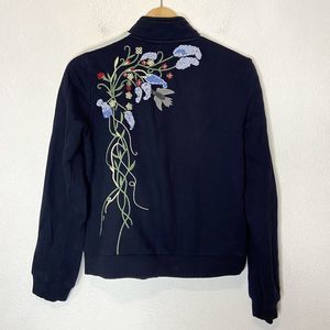 Navy bomber jacket with floral embroidery. Features zip closure and side pockets. Ideal for casual wear.