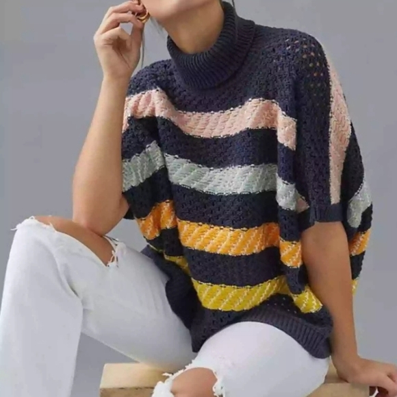 Anthropologie Navy Striped Turtle Neck Sweater Poncho sz OS