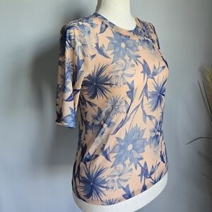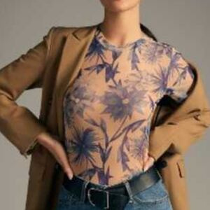 Anthropologie, New, Porridge Mesh Blue Floral Half Sleeve Top, Size Medium
