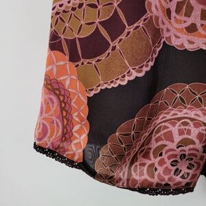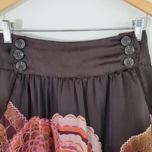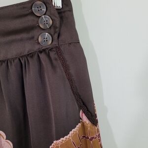 Anthropology Nick & Mo women's choco brown with beautiful bold colorful: brown, pastel, red, mustard, purple, cream, floral prints, lace embroidered trimmed, two side pockets, banded waistband, pleated, a-line style. The perfect flowy skirt for summer. Size Small.