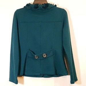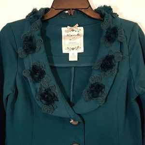 Anthropologie Nick Mo Blazer Sz S Jacket Teal Blue 3D Ribbon Flowers