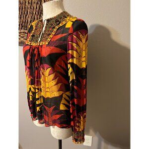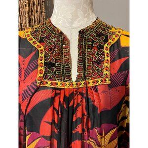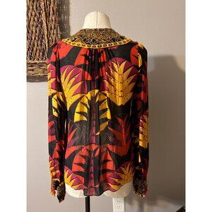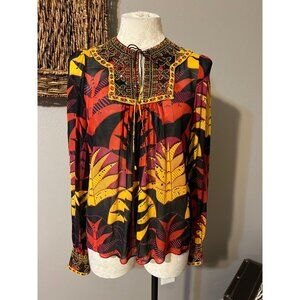 Anthropologie Nieves Lavi Top Red Black Yellow Medium M Beaded Long Sleeve Silk