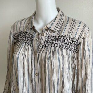 Loose Oversized Fit, Color Wheat with Blu & Black Striping, Lightweight, Embroidered Upper, Longer Back Hem, Button Front, Rounded Hemline