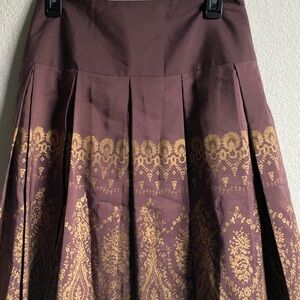 This elegant brown skirt features intricate gold patterns, perfect for adding a touch of sophistication to your wardrobe.