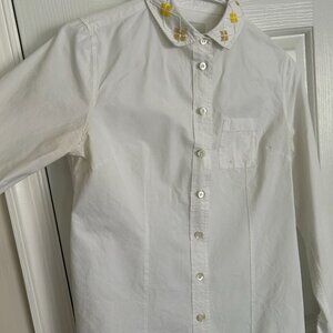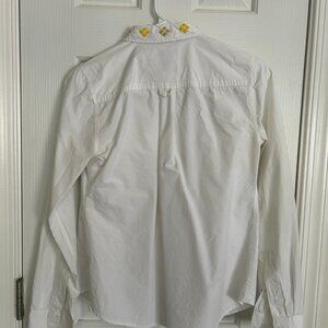 High quality 100% cotton women's button-down. Slight underarm stains that might require some care. Very comfortable, great workwear.