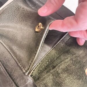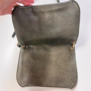 Vegan leather material in olive green. Great everyday purse with a deceptive amount of room. Fully adjustable strap that can be removed if desired. Suede like interior material.