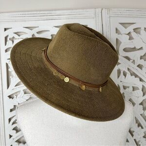 Anthropologie Olive Panama Hat in excellent condition. Worn maybe once! Very clean and ready to wear. Gold coin accents. One size (I’d say the fit is standard). Cotton poly blend.