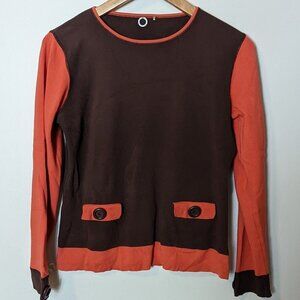 Coral and brown colorblock. Great condition. Soft, stretch knit top. Size small. Pit to pit is approximately 18 inches across. Top of shoulder to bottom hem is approximately 20.5 inches long. 65% Rayon and 35% Nylon