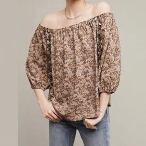 Anthropologie One September Green Peach Pink Floral Print Off The Shoulder Top Blouse