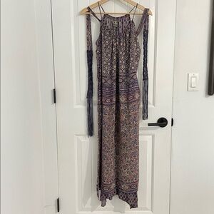 In excellent pre-own condition. Worn a few times. Beautiful dress for any occasion. Lined with a complementary patterned liner. String to hold sash up is broken on one side but doesn’t effect the dress. Straps are not adjustable.