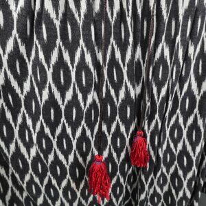 Seller Notes: Mixed fabric. Heavy embroidery at the bustline, jersey knit front body and sleeves, and sheer woven in the back. Tassles at the neck