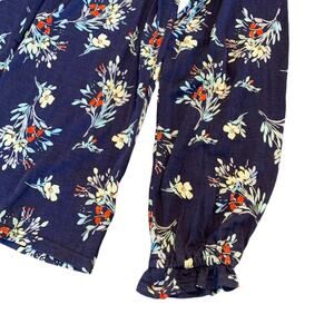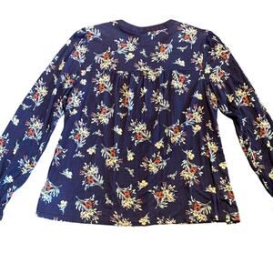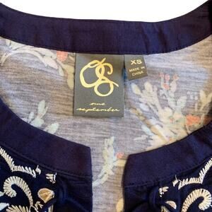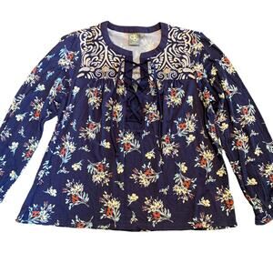 One September (Anthropologie brand), longsleeve top, navy blue floral pattern, embroidery bib detail, tie front