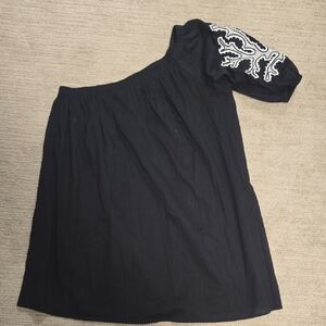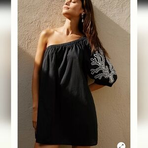 This chic black dress from Anthropologie is perfect for all occasions, featuring a one shoulder design and white circle embroidery that exudes elegance. Its timeless silhouette makes it an ideal choice for a stylish night out.