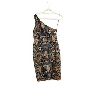 Step into effortless sophistication with this stunning Anthropologie one-shoulder midi dress. Designed to flatter and turn heads, this dress features a rich tapestry-inspired pattern in earthy tones of rust, sage, and ivory on a classic black backdrop. The eye-catching geometric and floral motif adds a unique bohemian flair, perfect for any occasion from sunset cocktails to wedding guest glam.