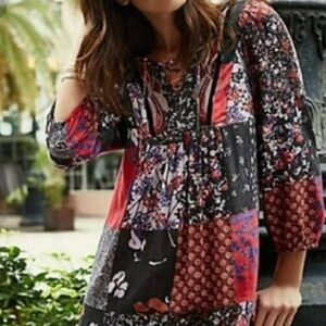 This stunning boho-chic Arcata dress from One September for Anthropologie is a true statement piece! Features a gorgeous patchwork print in vibrant shades of red, purple, orange, black and white. Long bishop sleeves and a flowy silhouette create an effortlessly elegant look. V-neckline with lace-up detail adds a touch of romance.