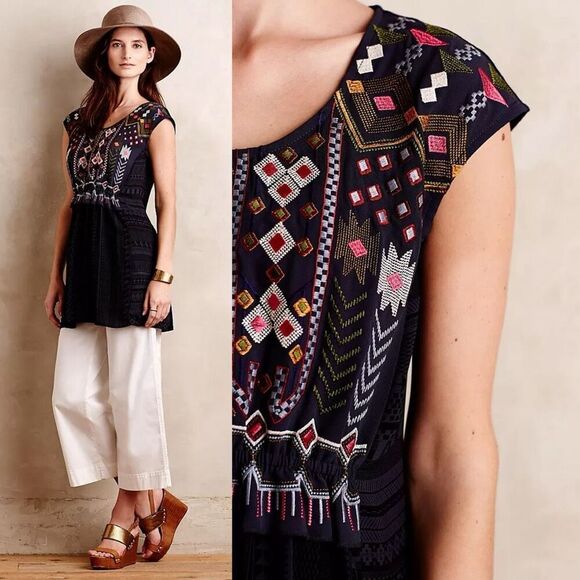 Anthropologie One September Barranco Embroidered Short Sleeve Bohemian Tunic